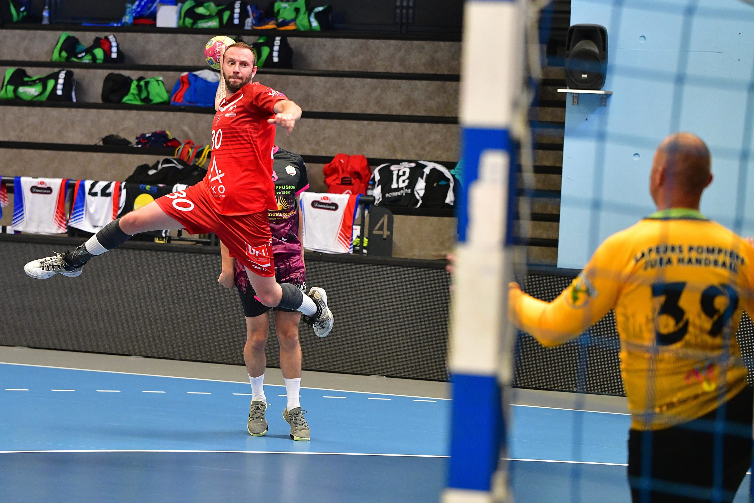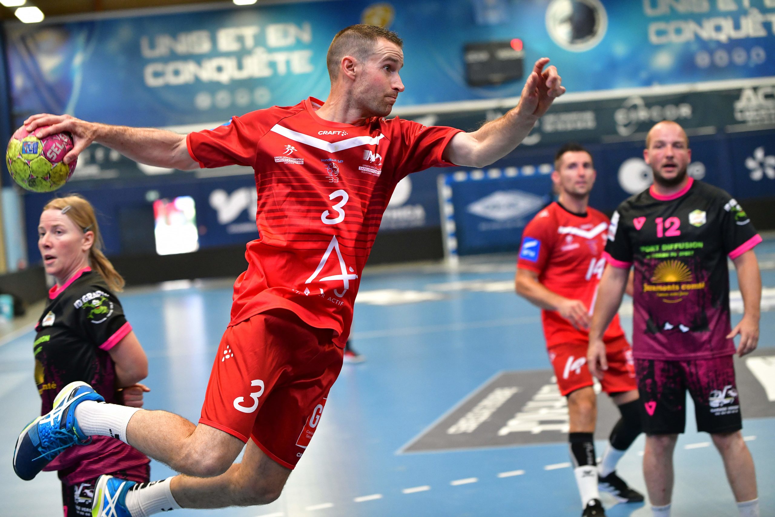 Le Jura est une formation que la Gironde a rencontré à deux reprises lors de précédentes éditions du championnat de France. Le palmarès était d’une victoire et d’un match nul. Ce match s’annonçait donc difficile. Le coup de sifflet retenti, le ¼ de finale est lancé. Les deux équipes sont au coude à coude pendant toute la rencontre. De nombreux échecs face au gardien adverse permettent aux Jurassiens de rester à une longueur des girondins. Le tableau d’affichage annonce un score de parité (10 à 10). Le scénario du ¼ de finale de 2022 a l’air de se reproduire. Il reste 10 secondes à jouer, la possession de la balle est girondine avec un coup franc aux 9 mètres. L’arrière s’élance, déclenche un tir, contré par la défense jurassienne, le ballon revient dans les mains de l’ailier droit girondin qui se retrouve seul face au portier du Jura, BUT !!! à deux secondes de la fin du temps règlementaire.